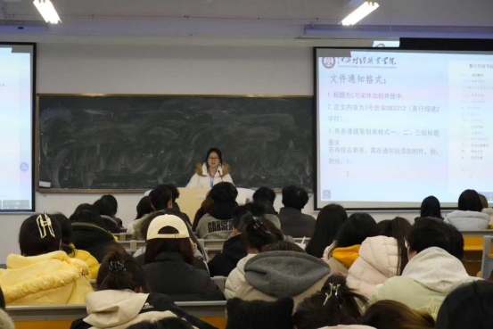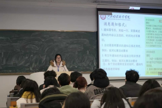 讲解过程中,刘欣怡同学结合实际工作案例,将格式要求与实操场景相结合,通过具体模板展示,让学生会成员直观掌握文书撰写技巧,针对易出错的排版、内容遗漏等问题进行重点提醒。参训学生干部认真聆听、做好笔记,积极梳理日常工作中的疑问,现场学习氛围浓厚。