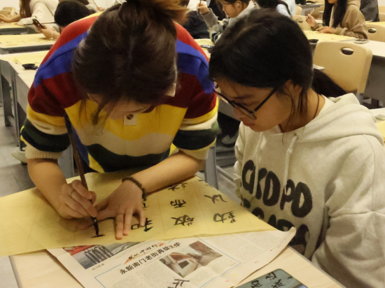 书法课上,授课学生导师系统示范执笔方法与笔画要领,引导学员体悟汉字书法的艺术魅力。