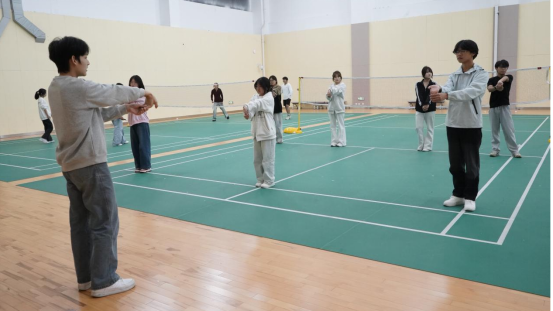 活动现场,蔡清首先带领同学们完成热身运动,随后开展专项教学。他围绕颠球、接球等基础技能进行示范讲解,针对学生动作中的不足逐一指导纠正,帮助大家掌握羽毛球运动的基本方法与技巧。学员们认真练习,积极参与互动,现场氛围有序且热烈。